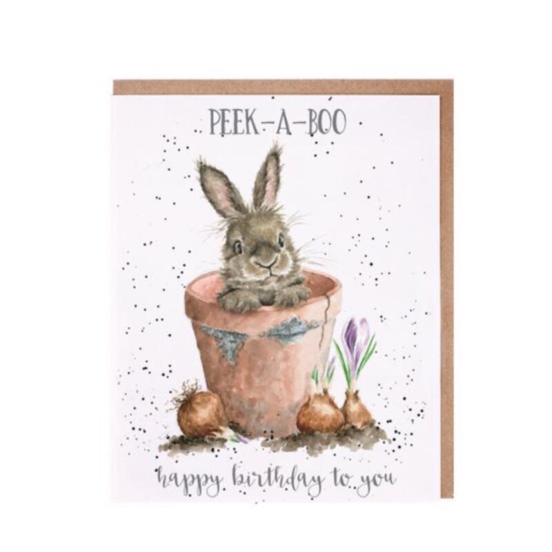 Send someone your birthday wishes with this lovely rabbit card which reads 'Peek-a-boo happy birthday to you' The card is printed on high quality, sustainably sourced textured board. It measures 6.77 x 4.84 inches and is supplied wrapped with a recycled, kraft envelope. The message inside reads 'have a wonderful day.'