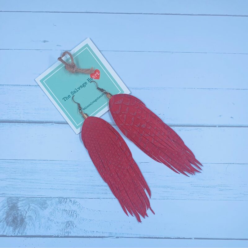 Original light weight leather feather statement earrings! The Salvage Heart is a Canadian based small business and all of our designs are hand made and cut (no die or laser cuts) from leathers and textiles that were salvaged from preloved clothing! We have carefully sourced and deconstructed each item for use in our designs…